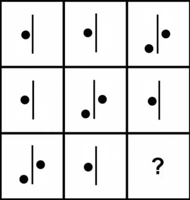 私は最初にこれを見たとき黒丸2つのパターンが右上のマスから左下のマスで共通しているように見えました。